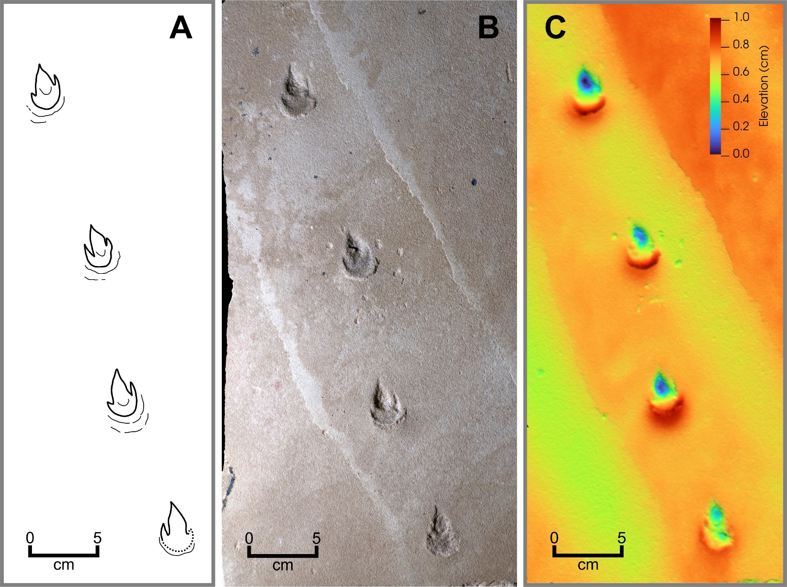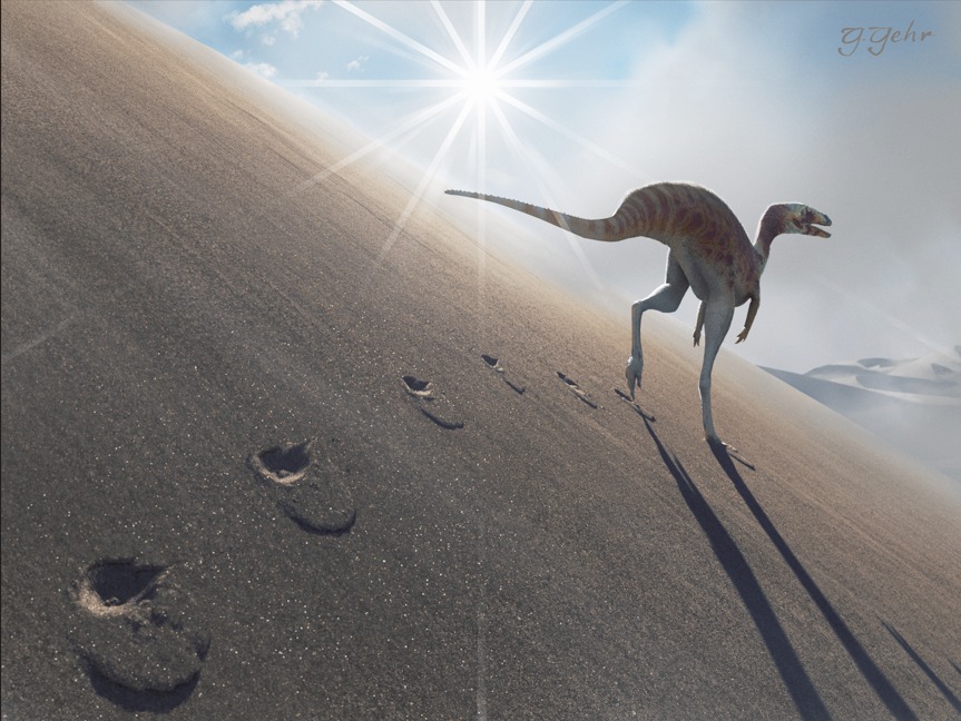 "As pegadas descritas pertencem a um pequeno dinossauro ágil e corredor, possivelmente ancestral de grupos como os noassaurídeos - terópodes de porte reduzido, velozes e muito adaptados a ambientes áridos - e os velociraptorídeos, parentes do famoso Velociraptor, conhecidos pela agilidade na caça. O predomínio do terceiro dedo indica uma locomoção quase monodáctila, ou seja, um modo de corrida em que o animal se apoiava principalmente em um único dedo, uma adaptação rara a ambientes desérticos, evidenciando a capacidade desses animais de se movimentarem nas dunas de paleodesertos", detalha Fernandes.
