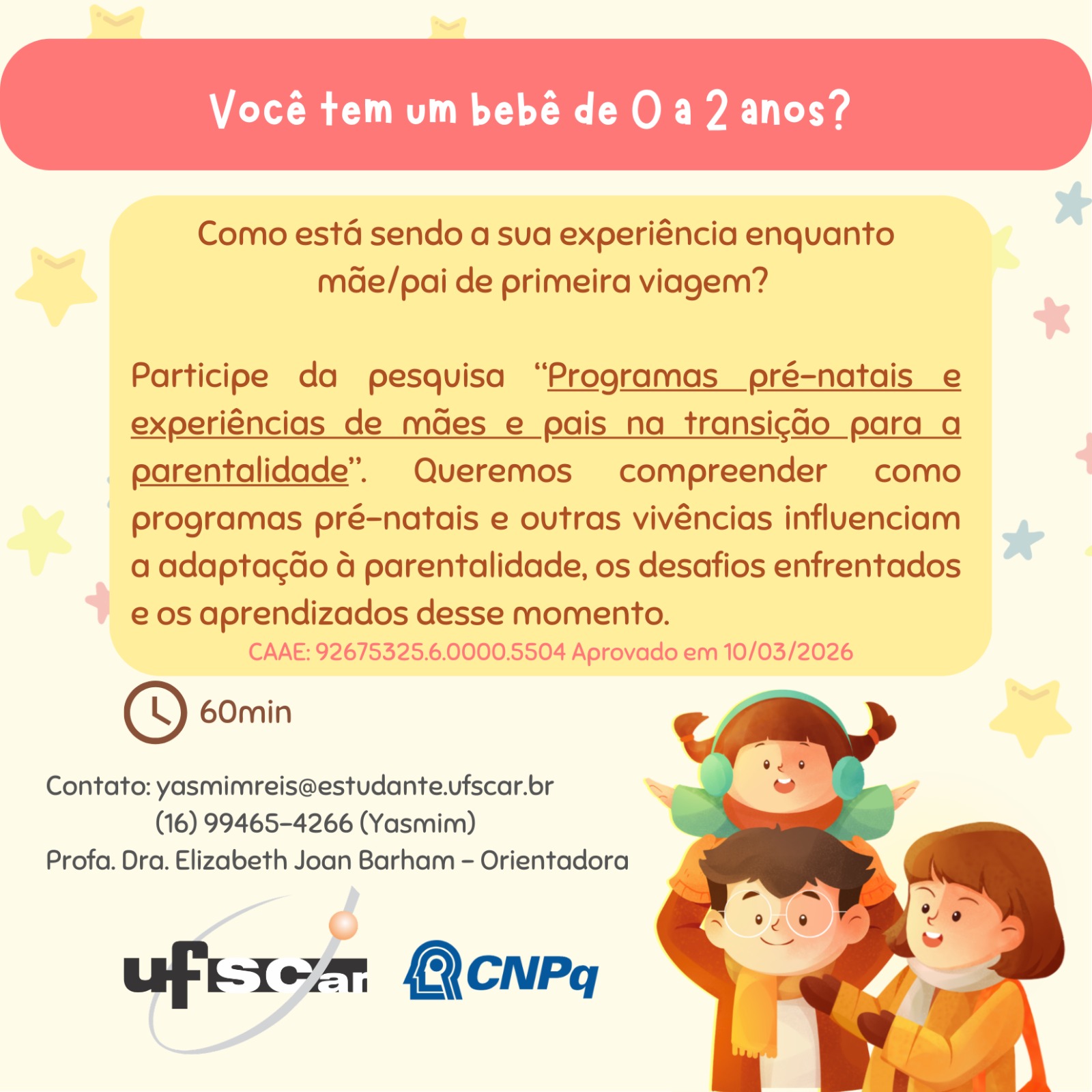O estudo, intitulado "Programas pré-natais e experiências de mães e pais na transição para a parentalidade", tem orientação da professora Elizabeth Joan Barham, do Departamento de Psicologia (DPsi) da UFSCar. O trabalho conta com apoio financeiro do Conselho Nacional de Desenvolvimento Científico e Tecnológico (CNPq). Projeto aprovado pelo Comitê de Ética em Pesquisa da UFSCar (CAAE: 92675325.6.0000.5504).