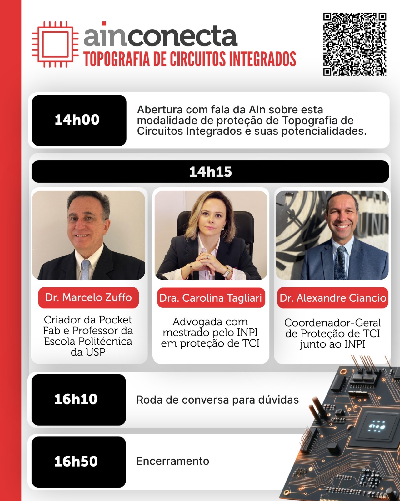O evento é gratuito, aberto às pessoas interessadas e acontecerá de forma online. As inscrições podem ser feitas em https://www.sympla.com.br/evento-online/ainconecta-topografia-de-circuitos-integrados/3362181.