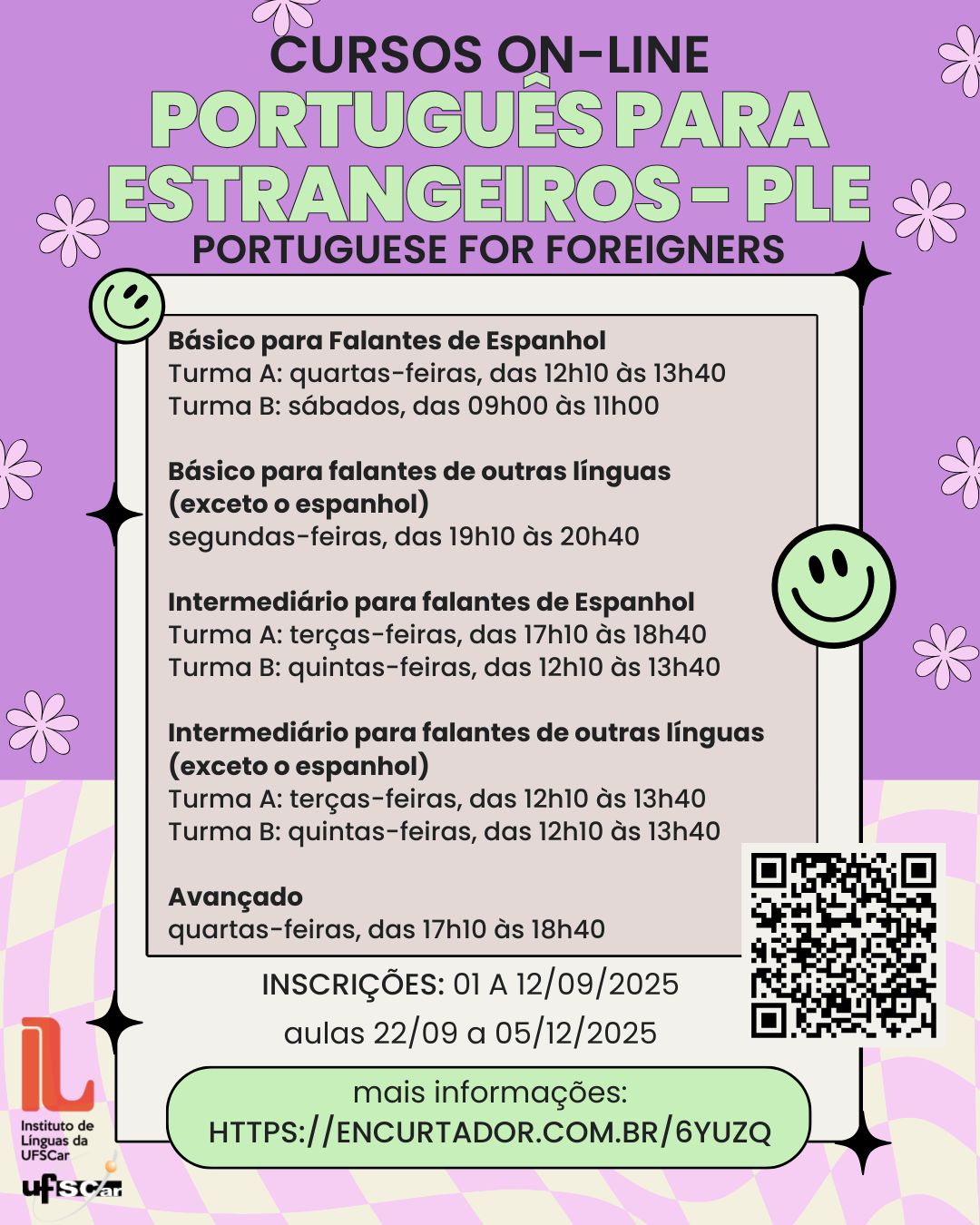 Inscrições e mais informações, incluindo turmas, níveis e horários das aulas, estão disponíveis no site do IL, em https://www.institutodelinguas.ufscar.br/pt-br/cursos/plano-emergencial_ple_2_2020.