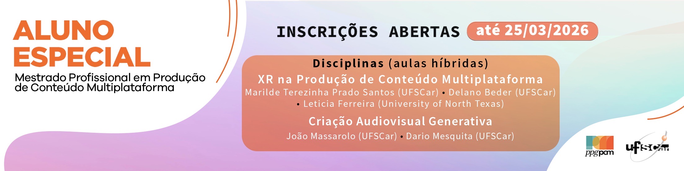 São ofertadas duas disciplinas, em formato híbrido: XR na Produção de Conteúdo Multiplataforma e Criação Audiovisual Generativa. A inscrição é gratuita, pela Internet e pode ser feita em apenas uma disciplina. A seleção será realizada por meio da análise da documentação dos candidatos, conforme instruções no site do Programa, em www.ppgpcm.ufscar.br/pt-br/processos-seletivos/alunos-especiais].